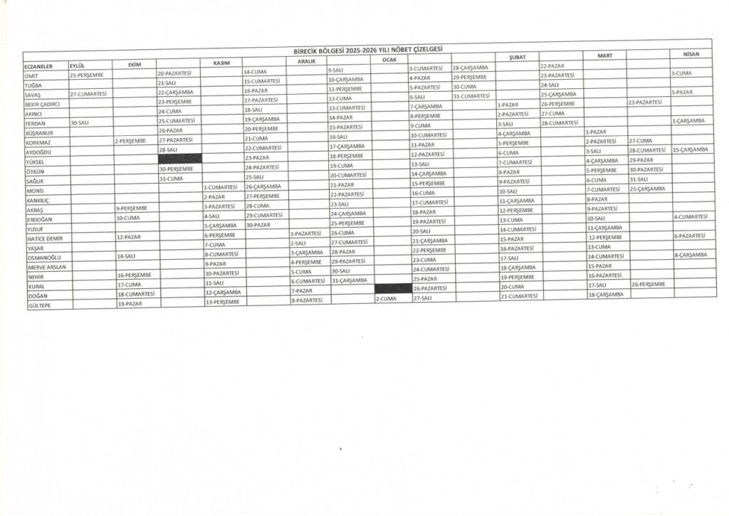 BİRECİK BÖLGESİ YENİ NÖBET ÇİZELGESİ